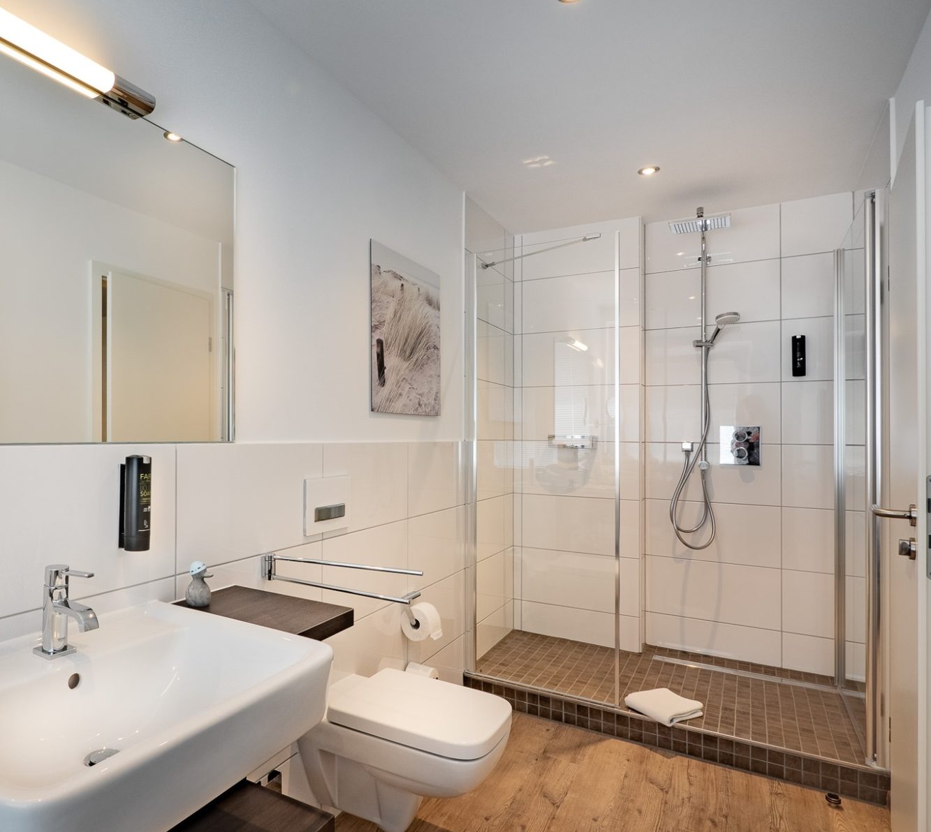 Die modernen Badezimmer sind mit Regenduschen und Hotelkosmetik ausgestattet. Hochwertige Betten und ein harmonisches Design sorgen für erholsame Nächte und echtes Wohlfühlambiente.